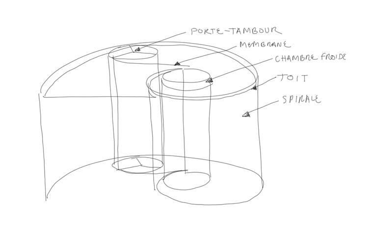 La température est basse – pas trop pour ne pas décourager les visiteurs, mais assez pour créer les conditions parfaites à la formation de cristaux d’eau dans la salle centrale. Le rôle de la spirale est de préserver la température dans son noyau. La porte-tambour assure l’interaction dedans/dehors avec un minimum de perturbation.